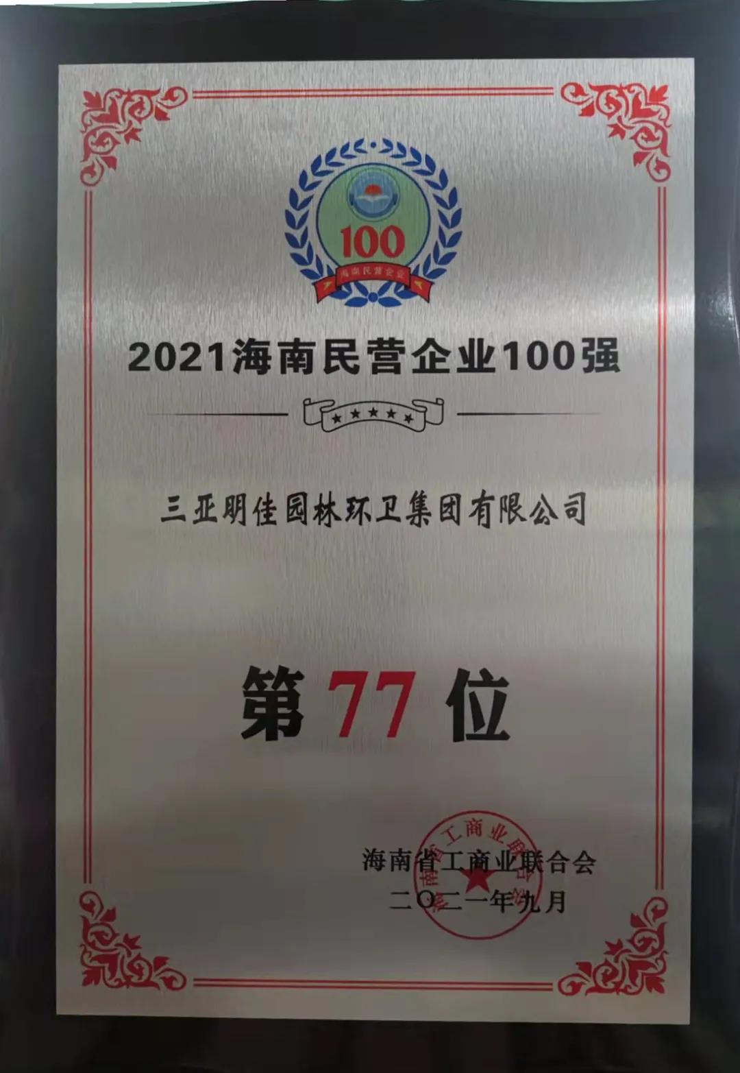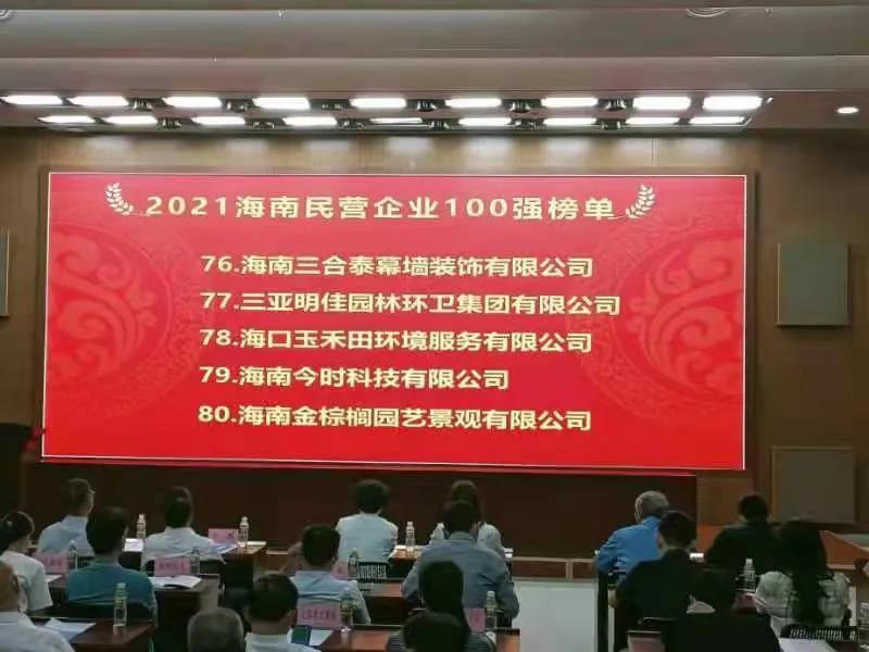 11月4日,海南省工商業(yè)聯(lián)合會在?诎l(fā)布“2021海南民營企業(yè)100強(qiáng)”榜單。三亞明佳園林環(huán)衛(wèi)集團(tuán)有限公司2019至2021年連續(xù)三年入選海南民營企業(yè)100強(qiáng)。